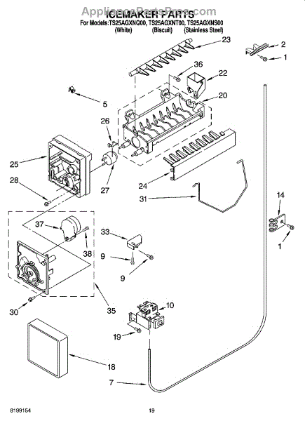 Causes of a bad Ice Container Assembly can include cracks or damage to the bin, which can lead to ice leaks or accumulation in the freezer; wear or malfunction of the dispensing mechanism, affecting its ability to deliver ice.