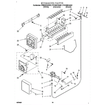 The Ice Container Assembly is an OEM part for Whirlpool refrigerators. This assembly includes the ice bin, where ice is collected, and often features integrated mechanisms or augers for dispensing ice through the refrigerator's door.