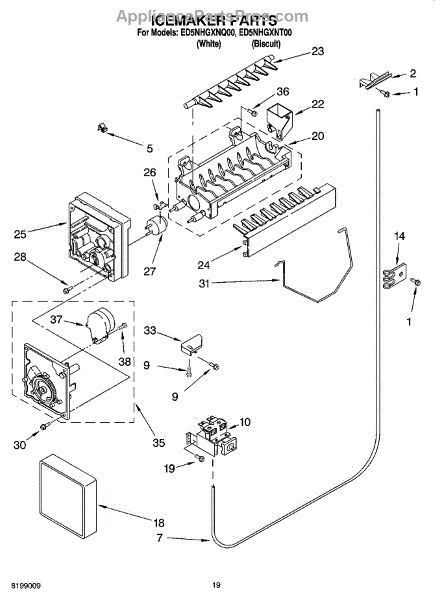 Causes of a bad Ice Container Assembly can include cracks or damage to the bin, which can lead to ice leaks or accumulation in the freezer; wear or malfunction of the dispensing mechanism, affecting its ability to deliver ice.