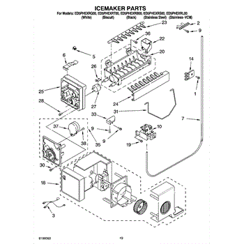 The Ice Container Assembly is an OEM part for Whirlpool refrigerators. This assembly includes the ice bin, where ice is collected, and often features integrated mechanisms or augers for dispensing ice through the refrigerator's door.