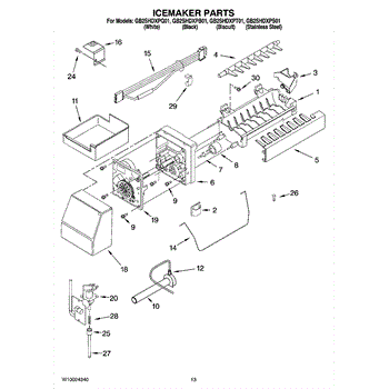 Replacement icemaker fill tube that directs water from the valve to the ice tray. Replace if cracked, leaking, or causing water to freeze in the freezer.