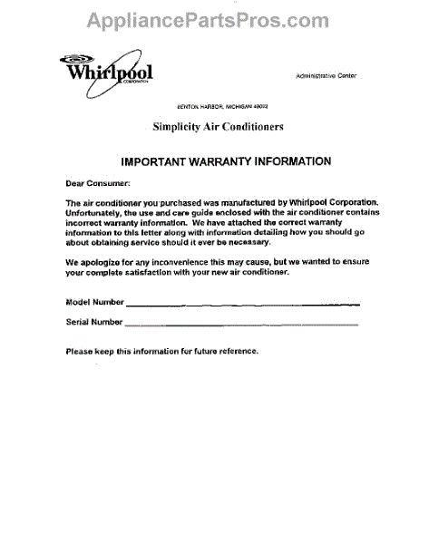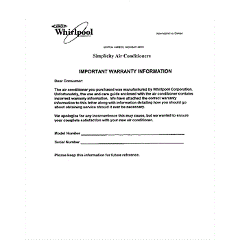 Parts for Whirlpool BJSSAC1000: 08 - Important Warranty Information Parts