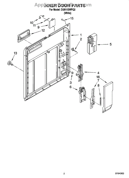 Parts for Whirlpool DU811SWPQ2: 02 - Inner Door Parts