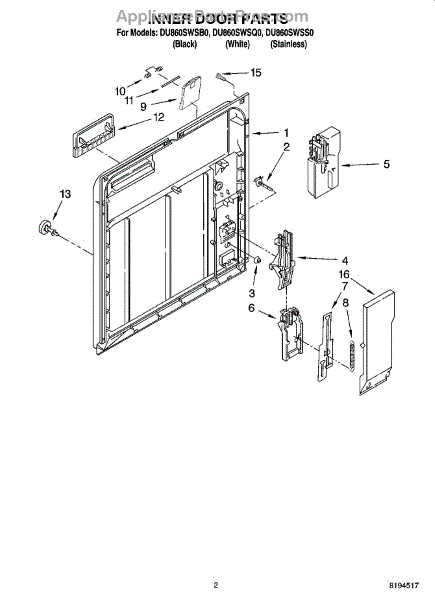 Parts for Whirlpool DU860SWSQ0: 02 - Inner Door Parts