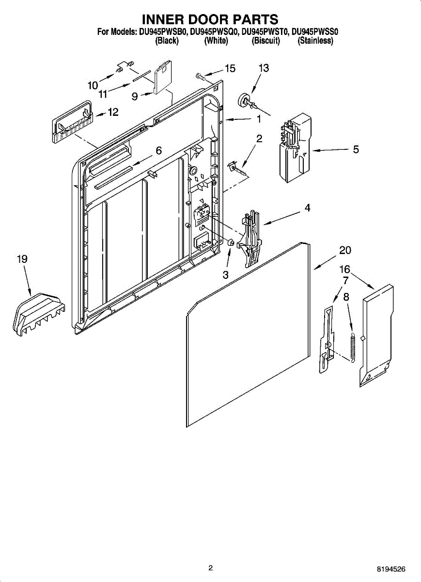 Parts for Whirlpool DU945PWSB0: 02 - Inner Door Parts
