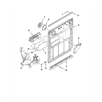 Inner door panel for dishwashers. Installs between outer door and tub. Replace if bent, cracked, or damaged. Includes mounting hardware locations.
