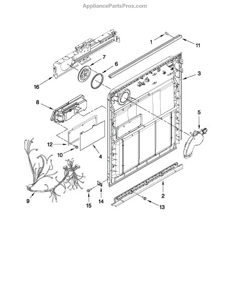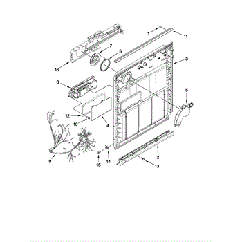 Inner door panel for dishwashers. Installs between outer door and tub. Replace if bent, cracked, or damaged. Includes mounting hardware locations.