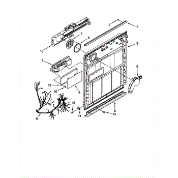 Inner door panel for dishwashers. Installs between outer door and tub. Replace if bent, cracked, or damaged. Includes mounting hardware locations.