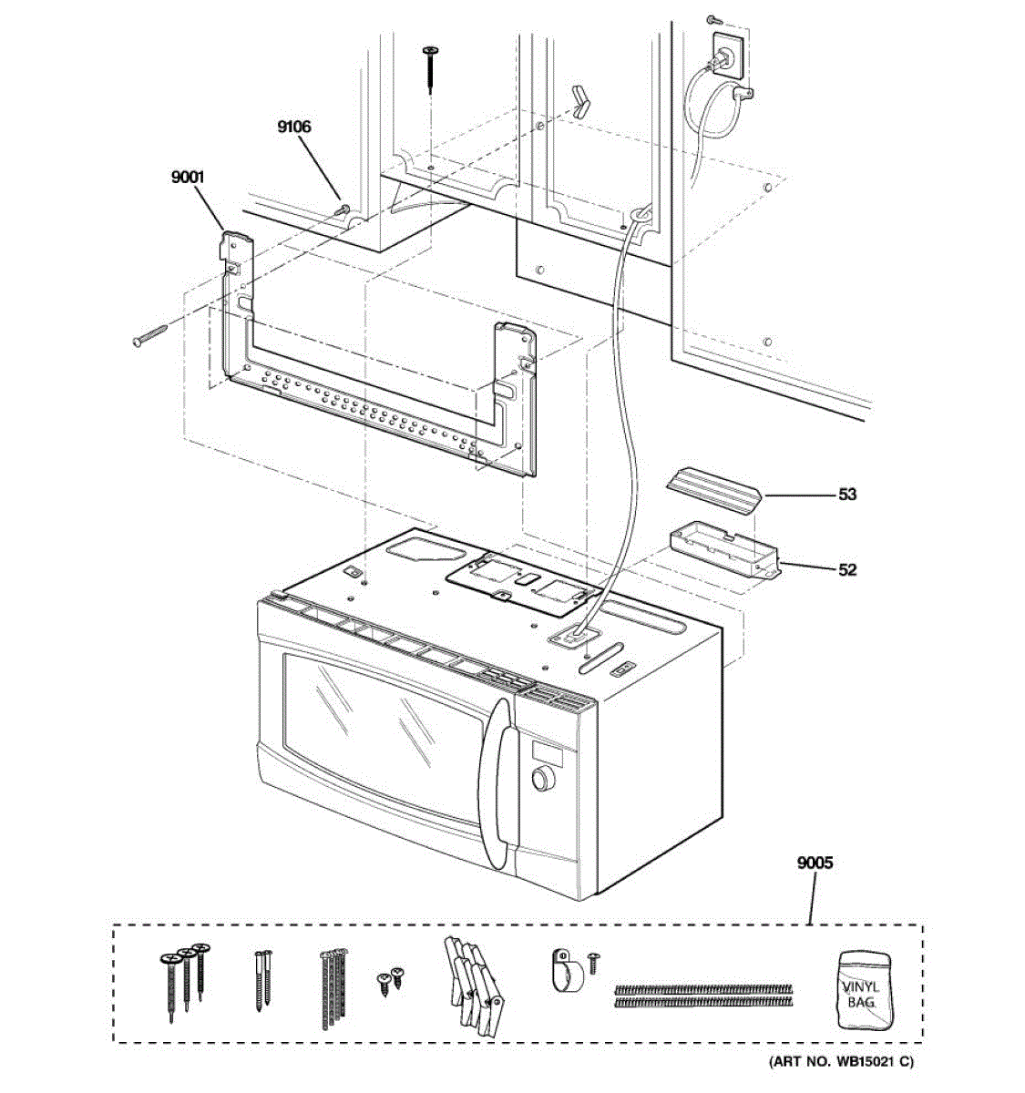Complete mounting hardware kit for installing over-the-range microwaves. Includes brackets and fasteners to secure unit above cooktop. Replace missing or damaged parts.