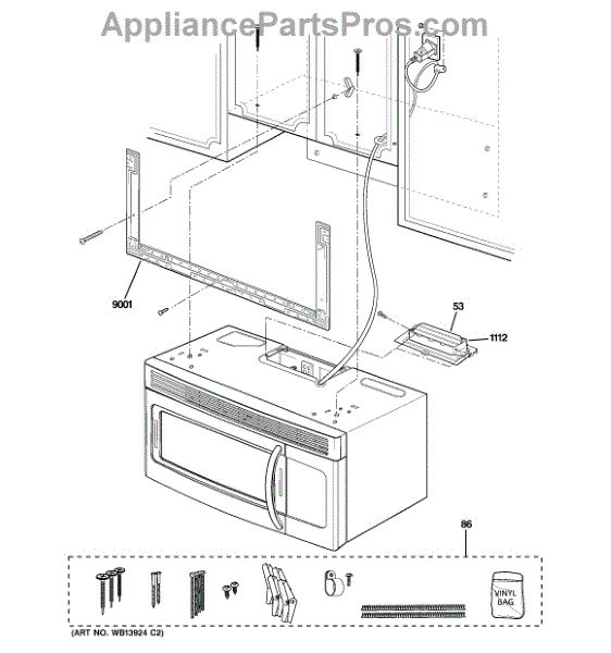 The Mounting Plate Assembly is an OEM part for GE microwaves. This component is designed to mount and stabilize the microwave over the range, ensuring it is safely anchored in its designated space. The mounting plate serves as an interface between the microwave and the wall or cabinet, distributing the weight evenly and providing a firm foundation for the appliance.