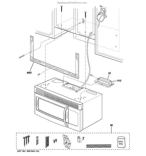 The Mounting Plate Assembly is an OEM part for GE microwaves. This component is designed to mount and stabilize the microwave over the range, ensuring it is safely anchored in its designated space. The mounting plate serves as an interface between the microwave and the wall or cabinet, distributing the weight evenly and providing a firm foundation for the appliance.