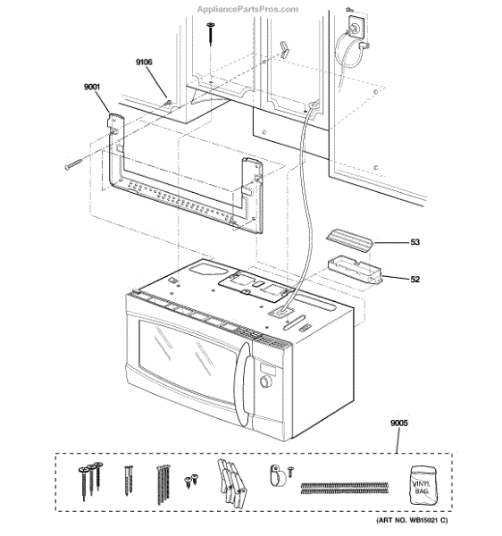 The Installation Hardware Kit is an OEM part for GE over-the-range microwaves. It contains brackets and fasteners used to securely mount the microwave above the range cooking surface.