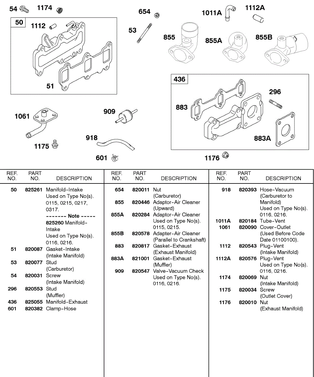 Parts for Briggs & Stratton 433447-0115-A1: Intake Manifold, Exhaust Manifold, A / C Adapters Parts