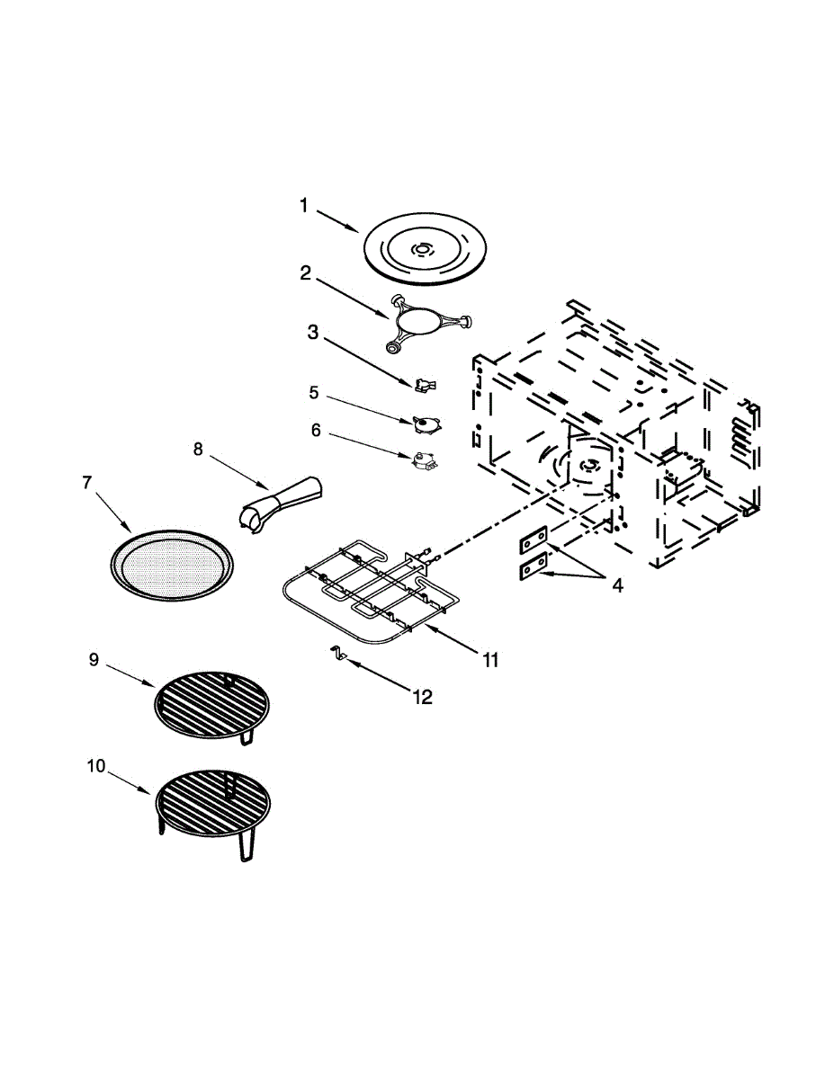 Metal rack for built-in microwave ovens. Installs inside cavity to provide elevated cooking surface. Replace if bent, warped, rusted, or missing.
