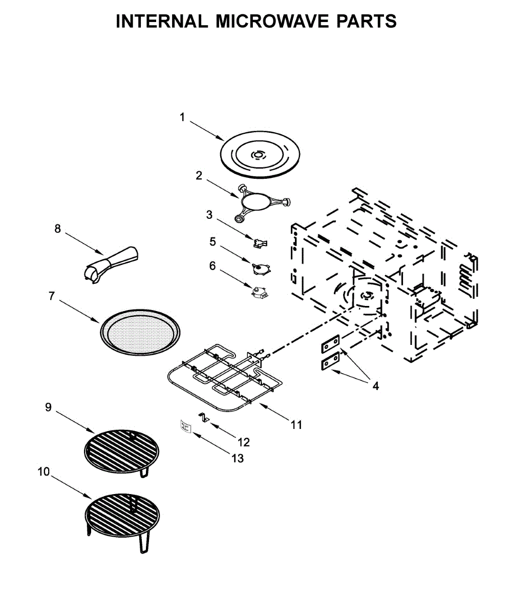 Metal rack for built-in microwave ovens. Installs inside cavity to provide elevated cooking surface. Replace if bent, warped, rusted, or missing.