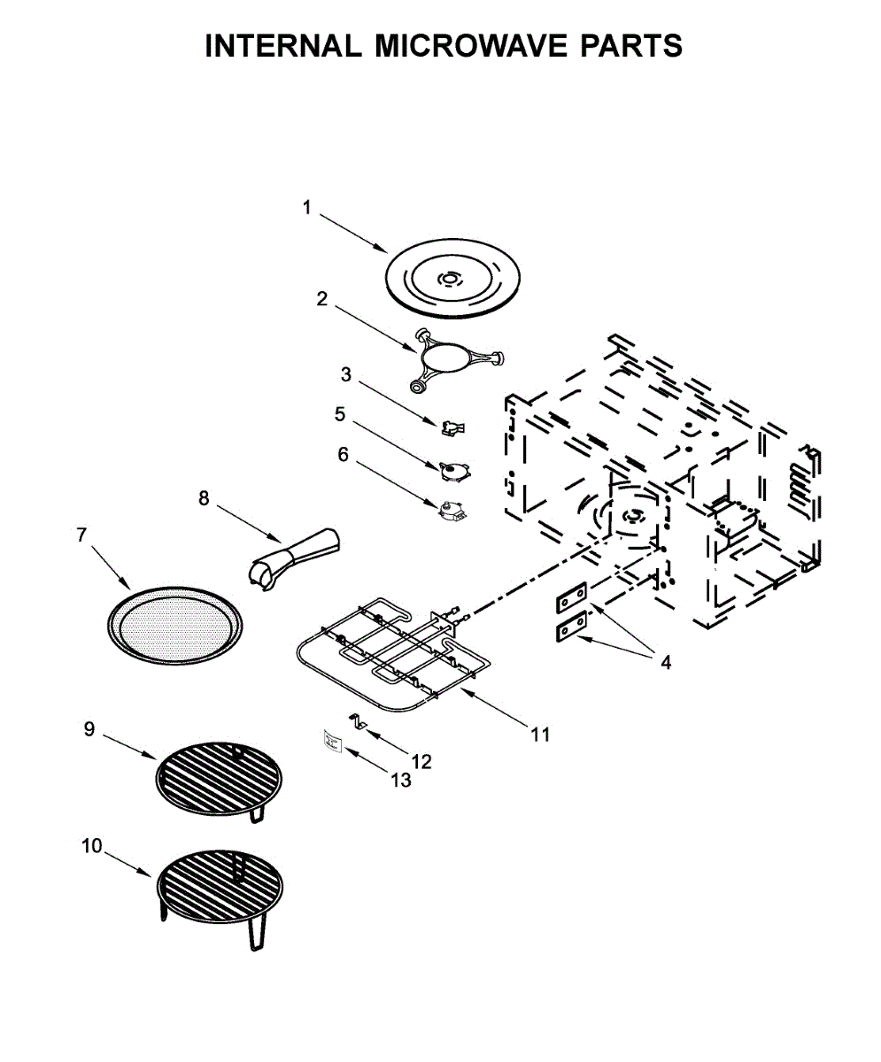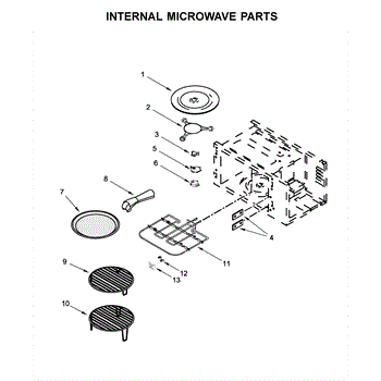 Metal rack for built-in microwave ovens. Installs inside cavity to provide elevated cooking surface. Replace if bent, warped, rusted, or missing.