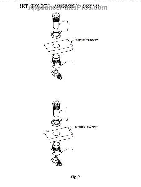 Jet holder assembly routes gas through the orifice to the burner. Replace if cracked, corroded, or stripped threads prevent secure installation.