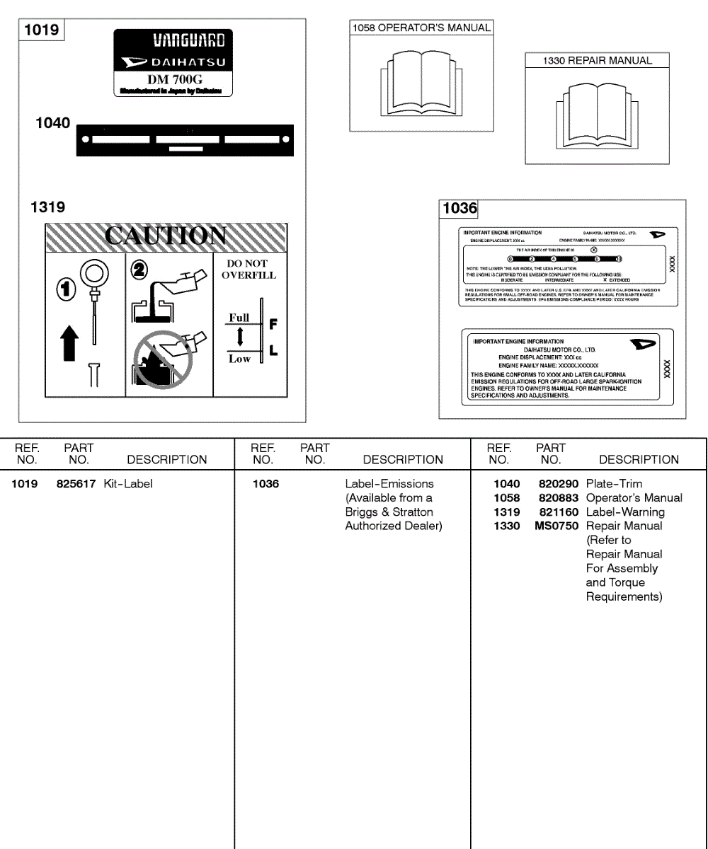 Parts for Briggs & Stratton 433447-0217-E2: Label / Emission Kits, Operator's Manual, Repair Manual Parts