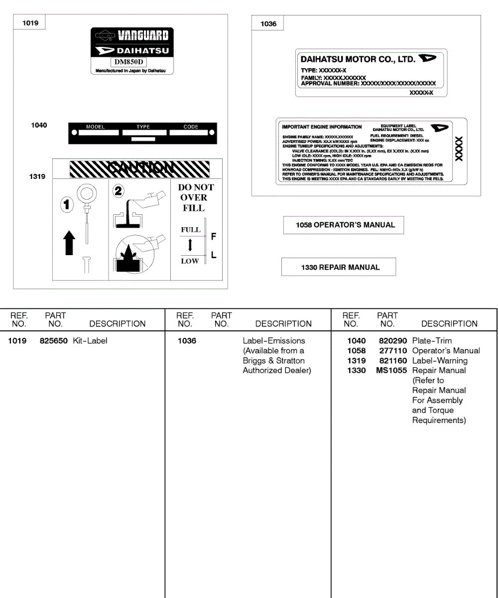 Parts for Briggs & Stratton 522447-0405-E2: Label Kit, Emissions Label, Operator's Manual Parts