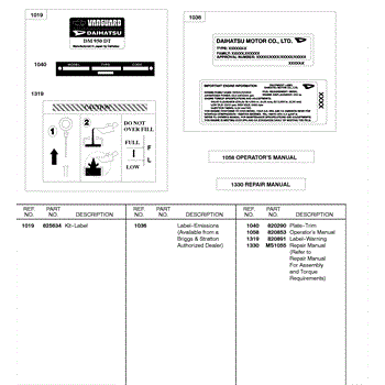 Parts for Briggs & Stratton 58A447-0231-E2: Label Kit, Emissions Label, Repair Manual Parts