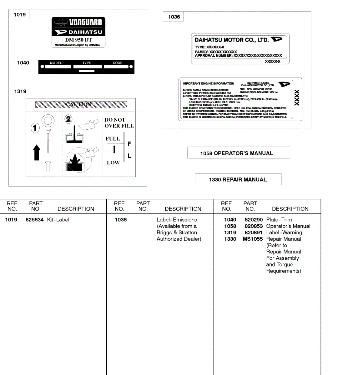 Parts for Briggs & Stratton 58A447-0309-E2: Label Kit, Emissions Label, Repair Manual Parts