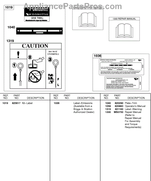 Parts for Briggs & Stratton 430447-0105-E1: Label Kit, Repair Manual, Operator Manual, Emissions Parts