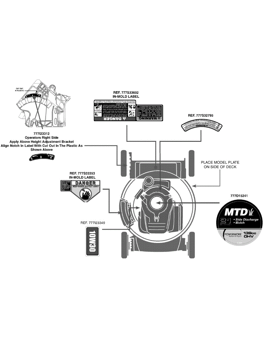 Replacement warning label for walk-behind lawn mowers. Installs on deck or handle to display safety information. Replace if faded, peeling, or missing.