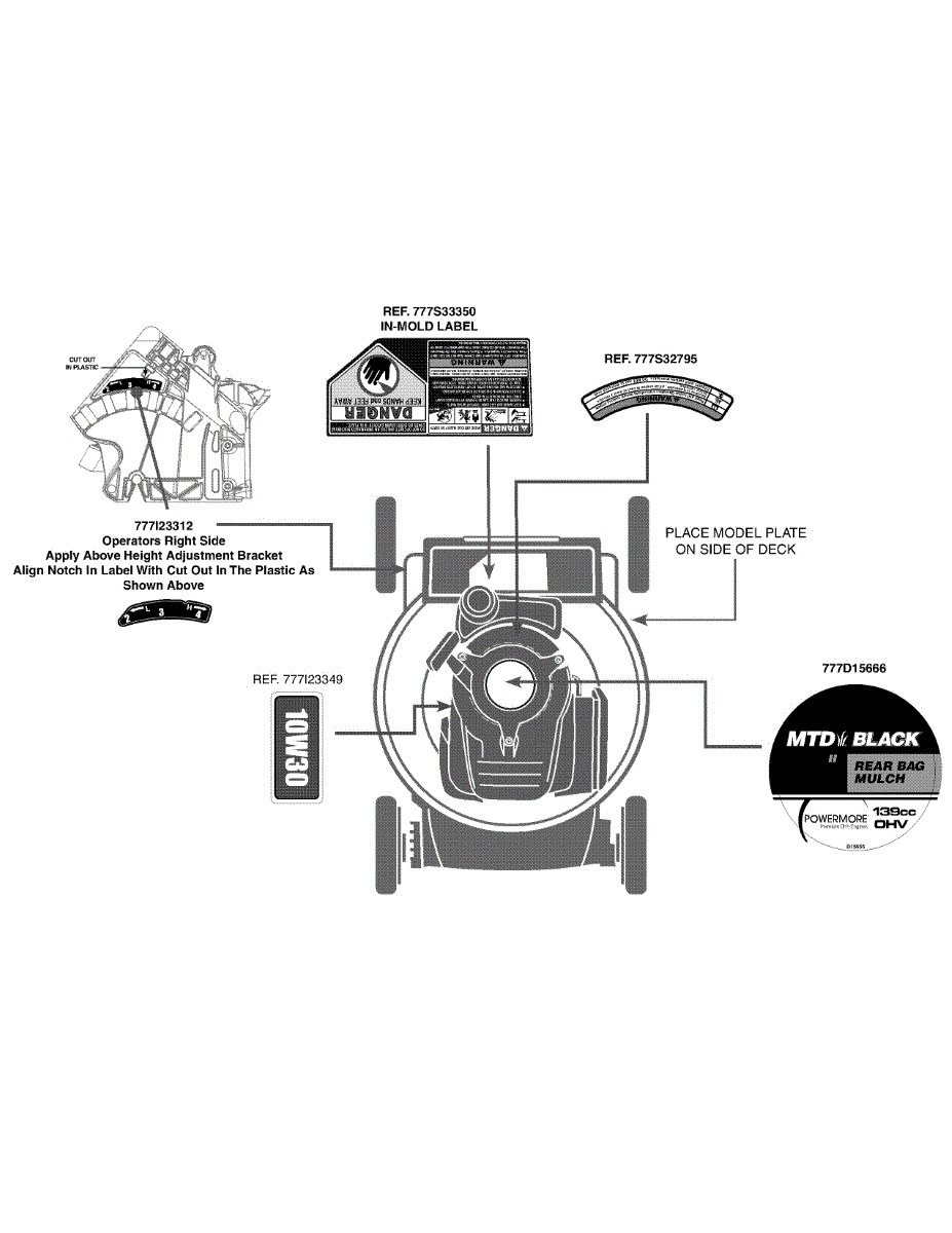 Replacement warning label for walk-behind lawn mowers. Installs on deck or handle to display safety information. Replace if faded, peeling, or missing.