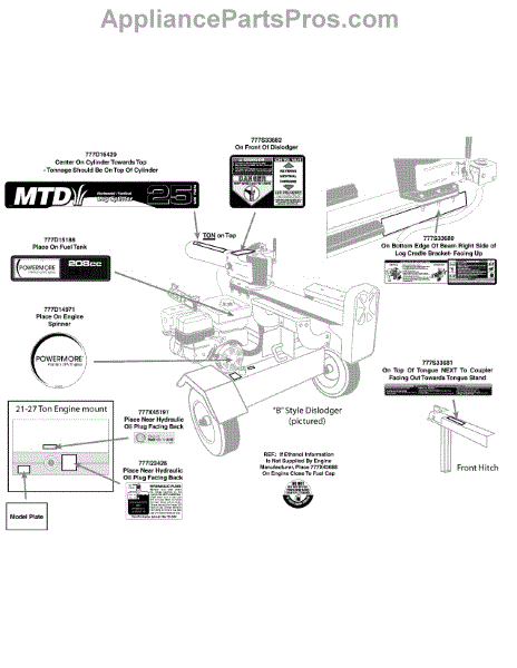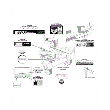 This part is a replacement label. This is a genuine OEM part made by MTD and has been sourced directly from the manufacturer. This part's intended use is to replace an unreadable or detached label in several varying models of log splitter.The purpose of these labels is to ensure that the equipment can be safely used by displaying critical information, safety warnings, or cautionary instructions. If labels become illegible, they must be replaced. It's important when working on or near an engine to make sure the equipment is powered off and completely cooled down before starting any repairs. For more accurate information on how and where to install this exact label, reference the appropriate owner's manual and specific equipment diagrams.This is an authentic OEM replacement part made of high-quality materials. This part can be used with log splitters that have been manufactured by MTD. Sold individually.