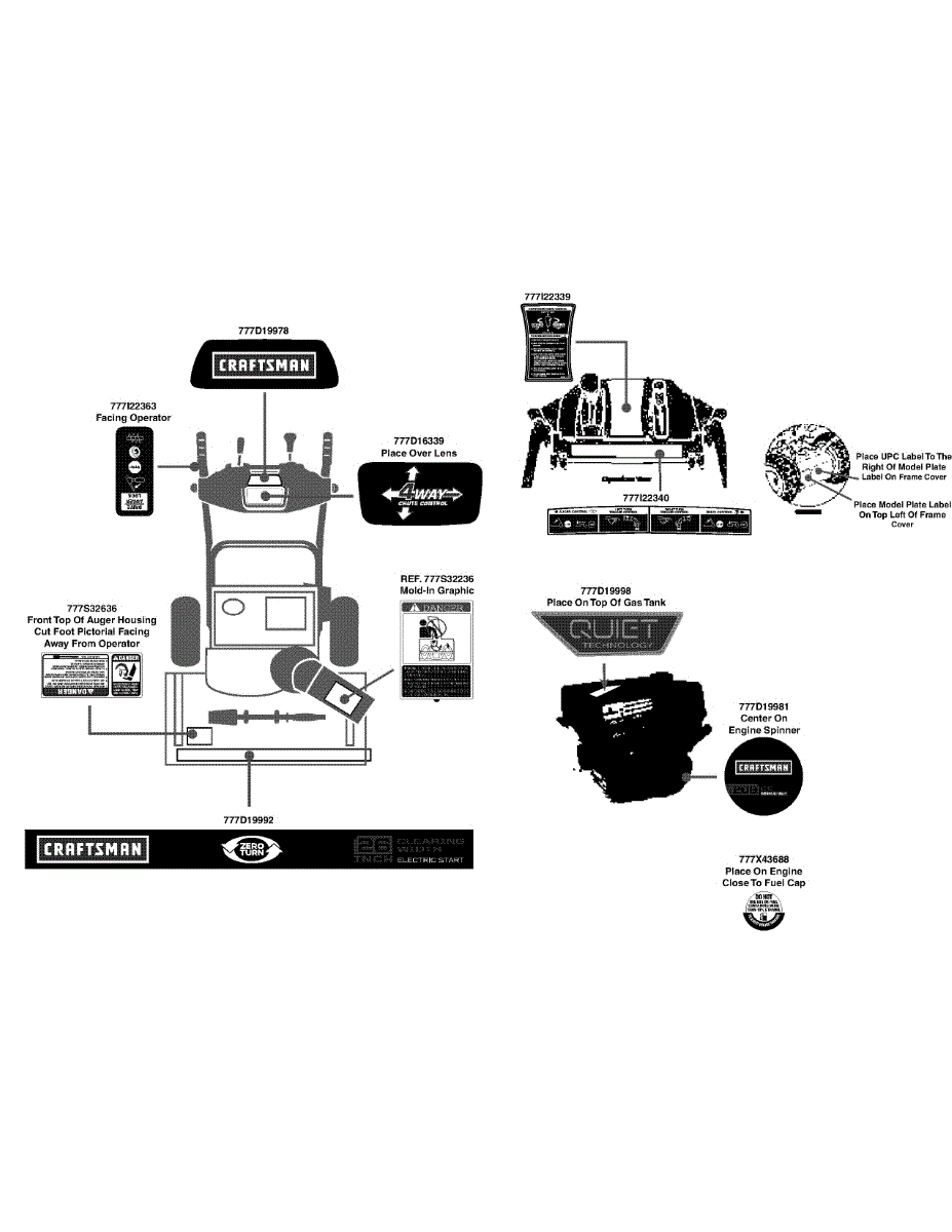 Replacement start/chute instruction label for gas snowblowers. Adheres to control panel or chute area. Replace if worn, faded, peeling, or missing.