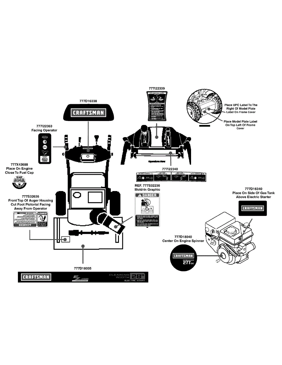Replacement start/chute instruction label for gas snowblowers. Adheres to control panel or chute area. Replace if worn, faded, peeling, or missing.