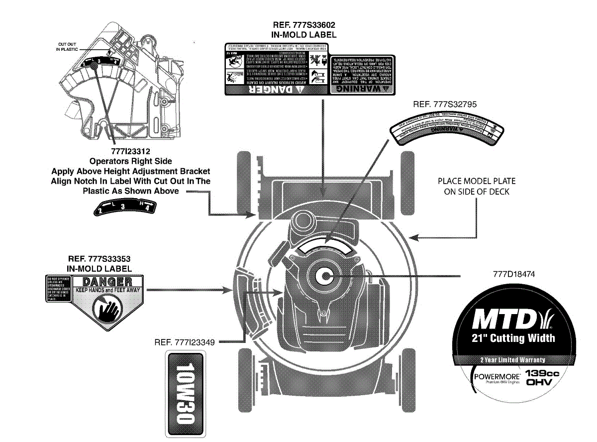 Replacement warning label for walk-behind lawn mowers. Installs on deck or handle to display safety information. Replace if faded, peeling, or missing.