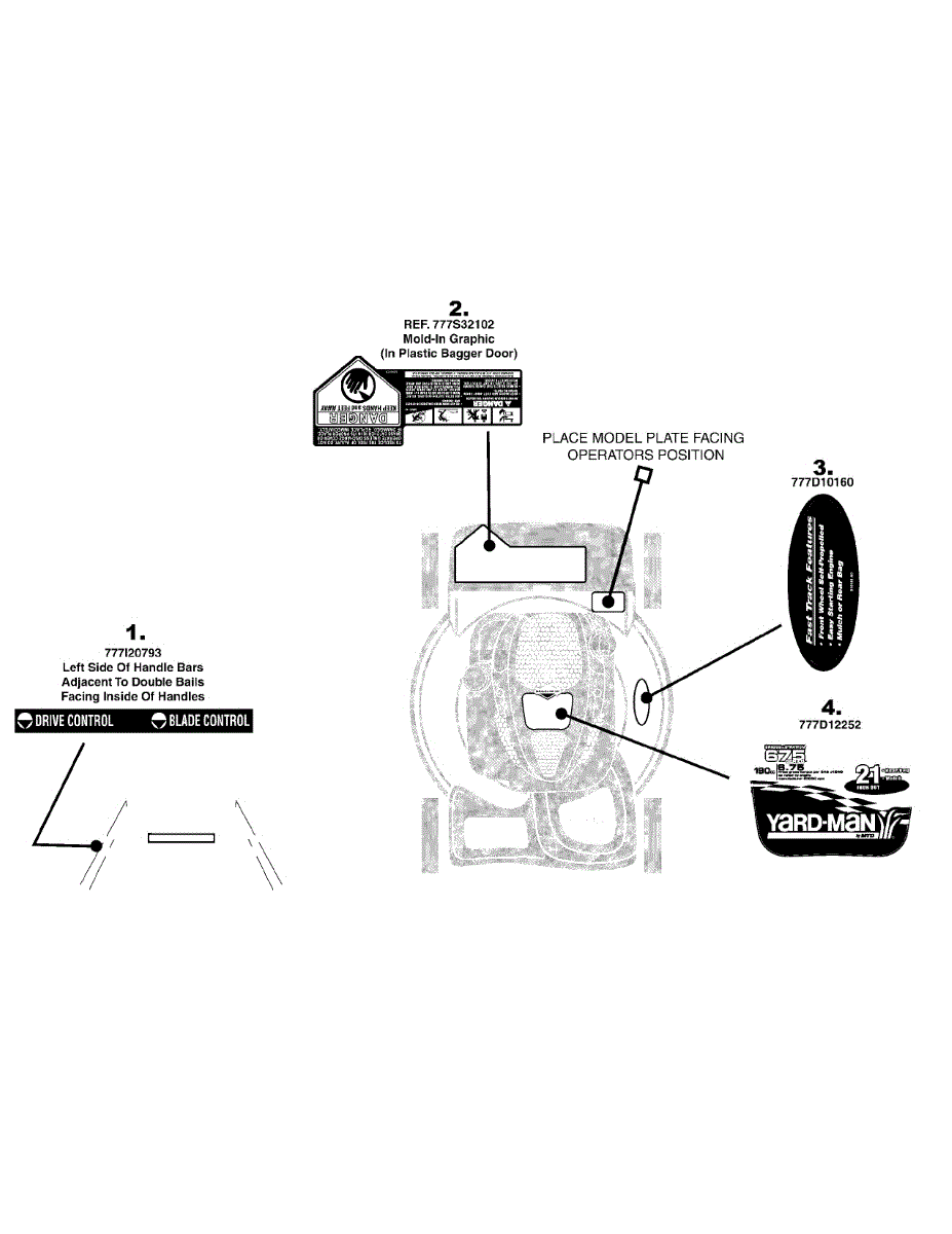 Handle label for self-propelled walk-behind mowers. Replace this decal if it's faded, peeling, worn, or missing to restore clear operation instructions.