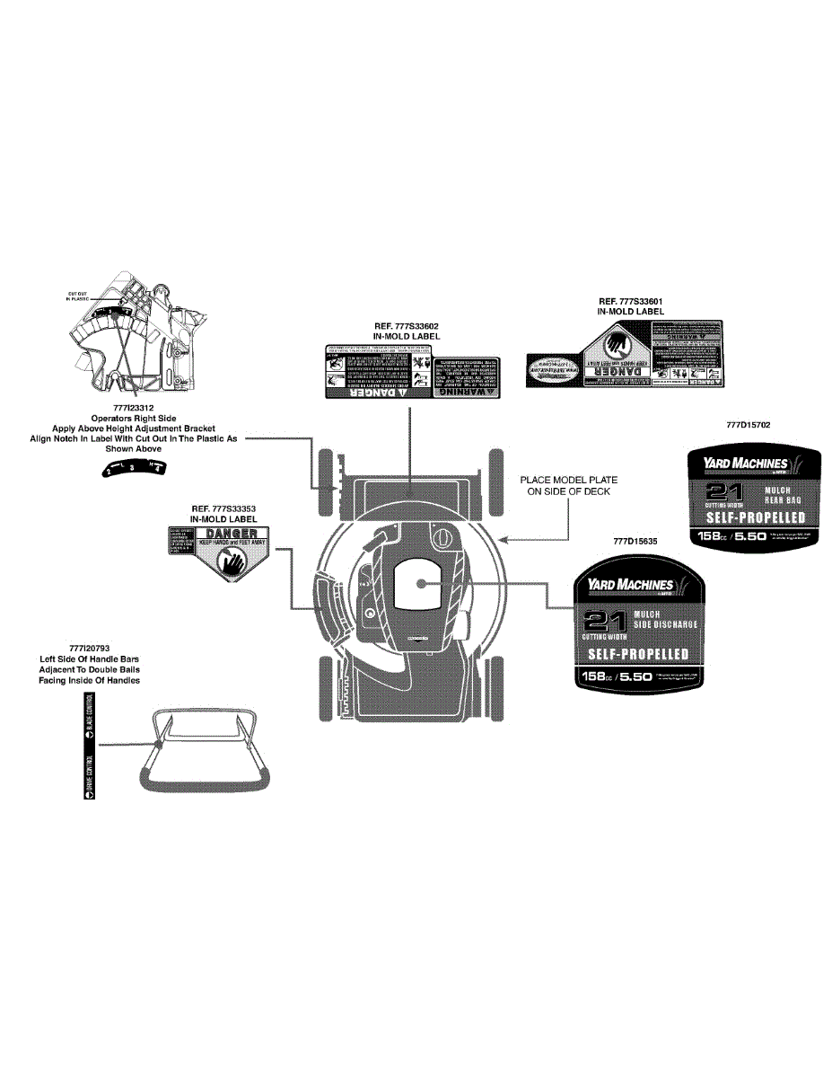 Handle label for self-propelled walk-behind mowers. Replace this decal if it's faded, peeling, worn, or missing to restore clear operation instructions.