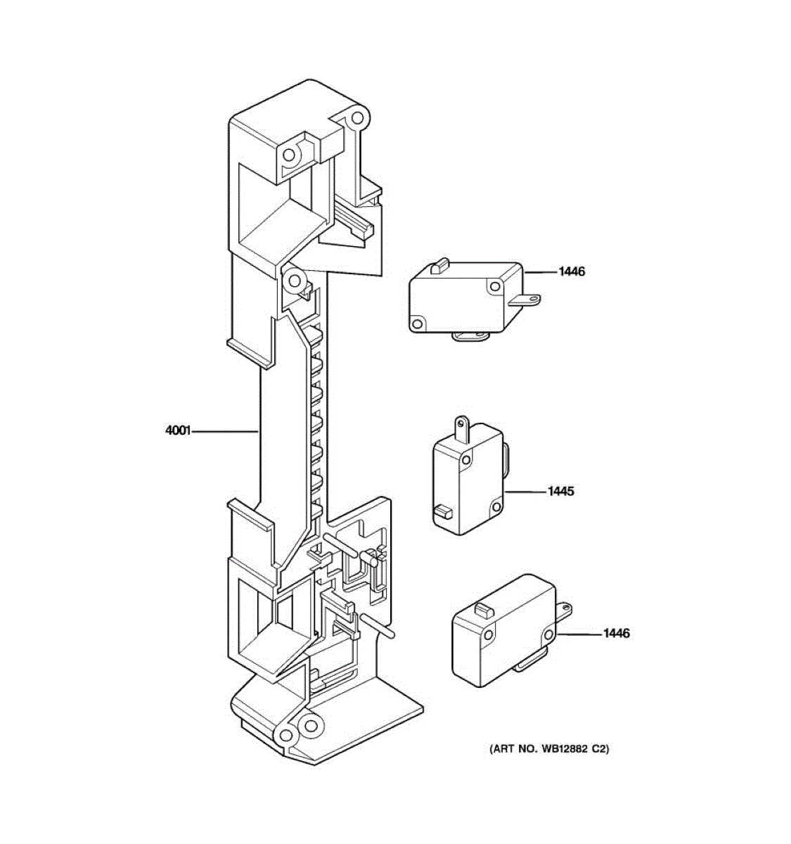 Molded bracket that holds and aligns door interlock switches and latch levers behind the front panel. Replace if cracked, warped, or brittle plastic broke.