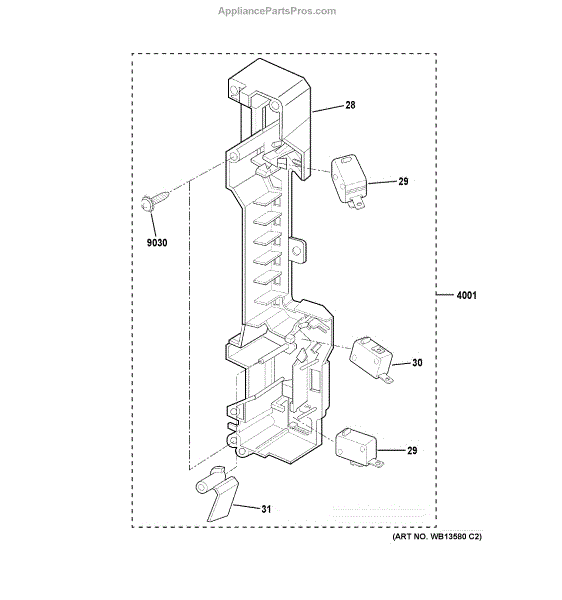 The Locker Holder Asm is an OEM part for GE microwaves. It secures and supports both the latch mechanism and door safety switches that holds the microwave door securely closed and prevents operation when open. This assembly works alongside other door components, such as the door handle and magnetron, to ensure a tightly sealed door and proper safety features for safe microwave use.