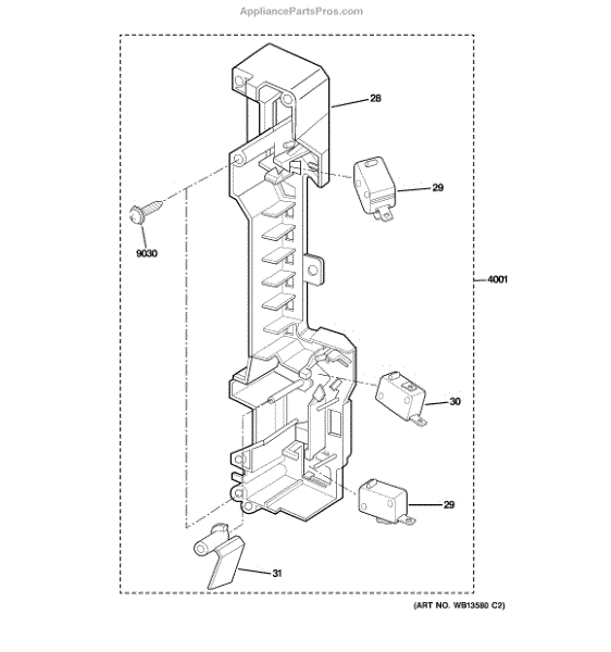 Causes of a bad latch and switch holder assembly can include cracked or broken plastic clips that mount it to the door, stripped mounting holes, or a deformed shape that prevents proper securing of the latch and switch mechanisms.