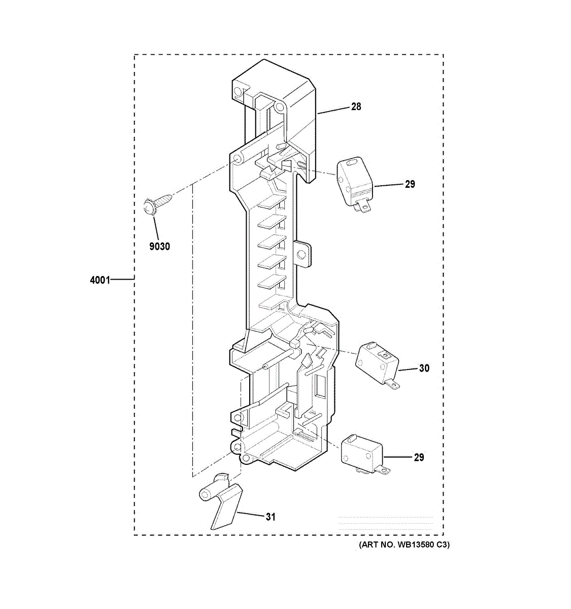 The Switch Holder is an OEM part for GE microwaves. It securely holds the door switches in place, ensuring that the microwave operates correctly and safely. The door switches detect whether the microwave door is closed, enabling the appliance to start cooking.