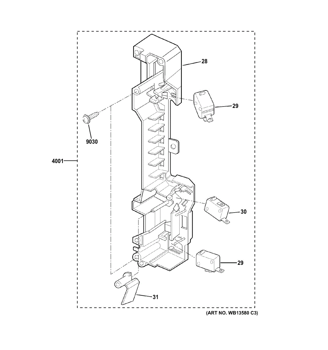 The Locker Holder Asm is an OEM part for GE microwaves. It secures and supports both the latch mechanism and door safety switches that holds the microwave door securely closed and prevents operation when open. This assembly works alongside other door components, such as the door handle and magnetron, to ensure a tightly sealed door and proper safety features for safe microwave use.