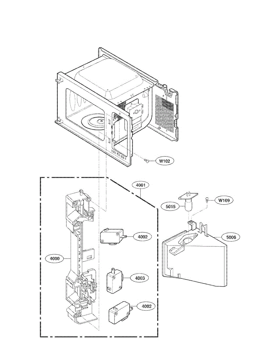 This holder assembly secures and guides the door latch components so the door closes firmly and the safety interlock switches engage. Replacing a worn holder restores reliable latching and helps the unit start consistently.