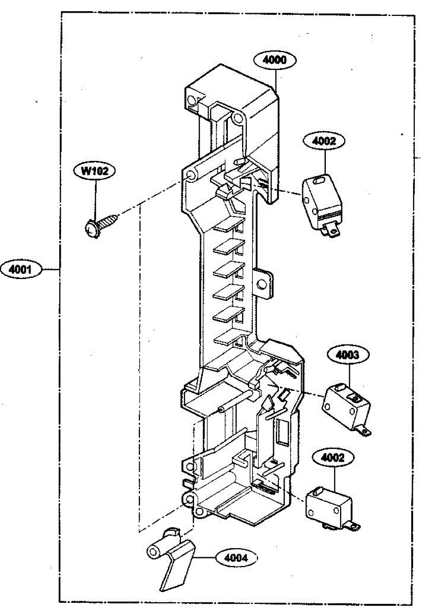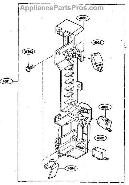 The Door Latch Housing and Interlock Switch Assembly is an OEM replacement part for LG microwaves. It consists of the protective door latch housing casing along with the two-door switches and interlock switch. The interlock switch prevents microwave energy from being generated inside the oven when the door is open. It shuts off all power once a faulty seal is detected between the door and cavity. Symptoms of issues can include: