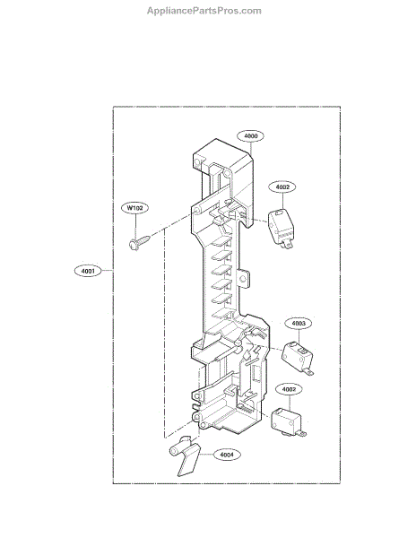 The Door Latch Housing and Interlock Switch Assembly is an OEM replacement part for LG microwaves. It consists of the protective door latch housing casing along with the two-door switches and interlock switch.