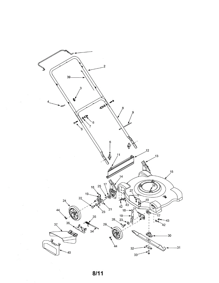 Replacement lower handle for walk-behind mowers. Installs at the base of the handle assembly. Replace if cracked, bent, broken, or damaged from impact.