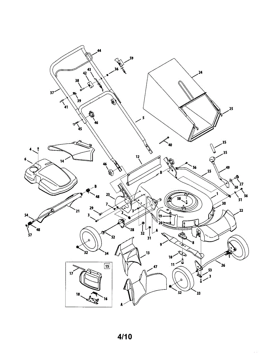 Replacement grass bag assembly for walk-behind mowers. Attaches to mower deck to collect clippings. Needed when original bag is torn, cracked, or missing.