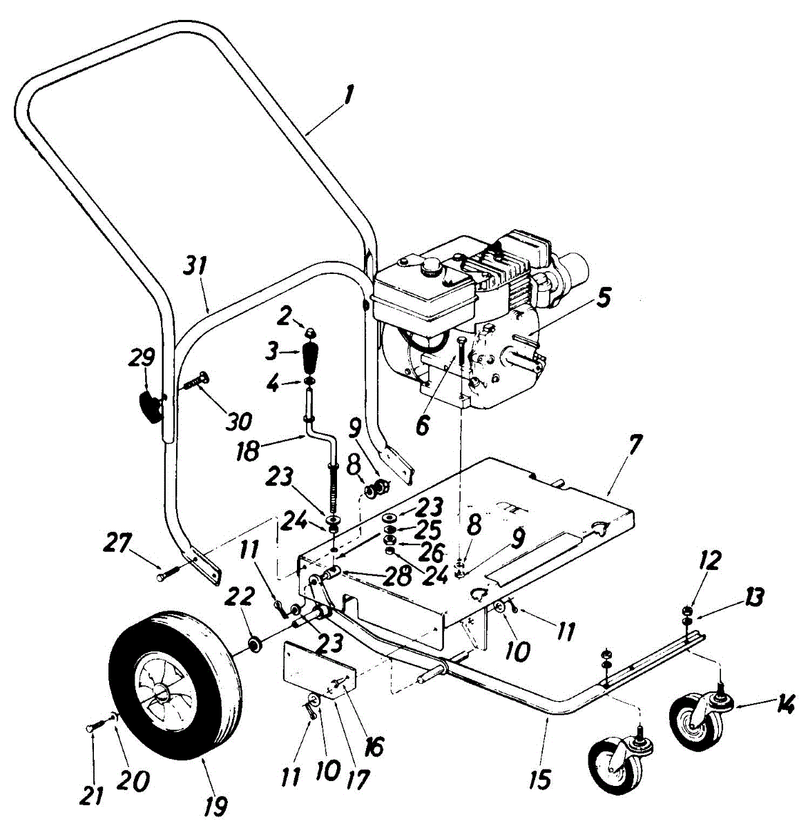 Caster arm assembly for blowers and outdoor power equipment. Replaces broken, cracked, or worn wheel mounting arms for stable mobility and support.