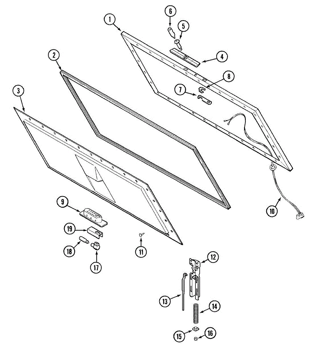 Replacement door hinge assembly for freezers. Mounts to the cabinet and door to provide smooth opening and closing. Needed when hinges are cracked or worn.