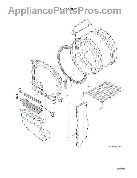 Dryer lint filter traps fibers to maintain airflow and drying efficiency. Replace if torn, damaged, or missing to prevent lint buildup. Confirm fit.
