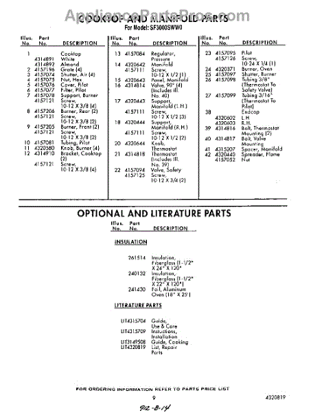 Parts for Whirlpool SF3000SWN0: 09 - Lit / Optional And Literature Parts