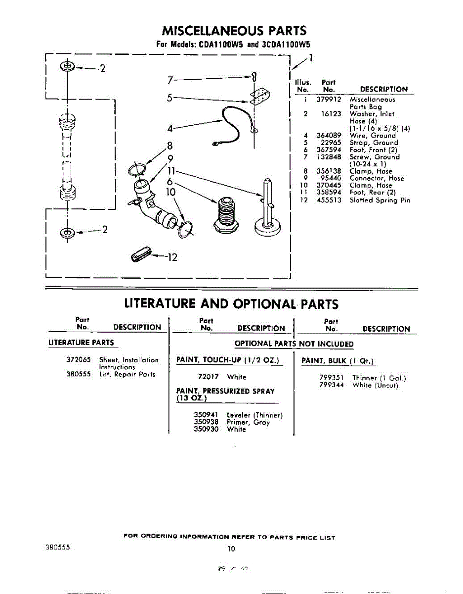 Parts for Whirlpool CDA1100W5: 10 - Lit / Optional Parts
