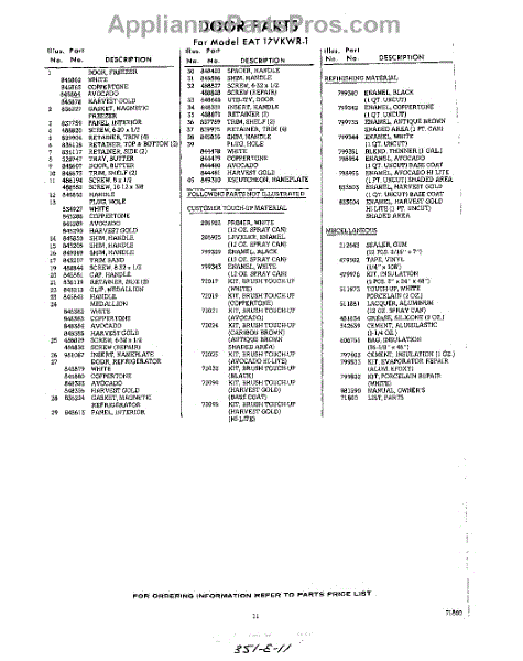 Parts for Whirlpool EAT17VKWR1: 11 - Lit / Optional Parts